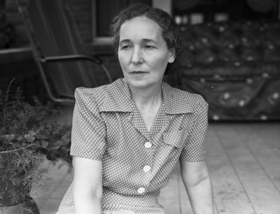 Miss Stella Brown, whose garden won second prize in the Class AA category of the Arlington Junior Chamber of Commerce's yard beautification contest. She is sitting on the porch of her house. She is wearing a polka dot dress with buttons down the bodice and a wide collar. Behind her, on the porch, is a lawn chair.