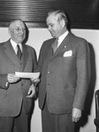 Ralph Budd, president of Burlington System (left) presents a $5,000 check to Clay J. Berry, Red Cross War Fund drive chairman, on behalf of the Fort Worth and Denver Railway. The two men are dressed in suit and tie. Mr. Berry is looking down at the check Mr. Budd is handing to him. Behind them is a wall with a long window.