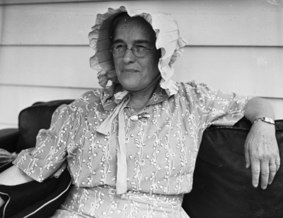 Mrs. J. D. Petty, whose garden won first prize in the Class A category of the Arlington Junior Chamber of Commerce's yard beautification contest. She is sitting on a couch outside of her home. She is wearing a floral print dress, checkered bonnet, eyeglasses and a watch on her left wrist.