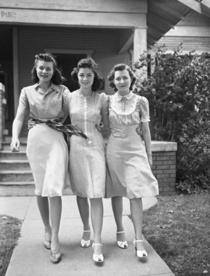 Three sisters, daughters of Mr. and Mrs. A. F. Small, are, from left to right, Leefreda, Emma Jo and Marjorie Lane. They are standing outside of their parents' home. Leefreda has just returned home fro Denton, Texas, where she was a student at North Texas State Teachers College, which she will re-enter in the fall. Emma Jo was a member of the season's graduating class of Paschal High School. Marjorie Lane will become the bride of Mr. Orville Britt Paty on June 29 at First Presbyterian Church. Leefreda is wearing a collared blouse tucked into a skirt that is belted with a striped scarf. Emma Jo is wearing a dress with a front zipper from the collar down the bodice, stopping at the waist. Marjorie Lane is wearing a dress with a lace collar and lace detailing on the bodice and on the edge of the sleeves. They are all wearing open-toed shoes. Emma Jo and Marjorie Lane are wearing identical shoes.