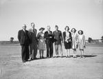 Tense drama against a military background characterized the presentation of the nation's highest award, the Congressional Medal of Honor, to the widow of a Texas hero, Staff Sargent George D. Keathley of Lamesa, Texas, April 11 afternoon on Scott Hill parade ground at Camp Wolters at a retreat parade. The family of Staff Sergeant Keathley pose after the parade, left to right: W. C. Leberman, Olney, Texas, an uncle; John A. Keathley, Lawton, Oklahoma, a brother; Mrs. W. F. Keathley of Olney, Texas, the mother; W. F. Keathley, the father; General Bruce Magruder, commanding the Infantry Replacement Training Center, who presented the medal; Mrs. Geneva Keathley of Lamesa, Texas, and the two daughters, Helen Joy Keathley and Paula Jean Keathley. Published in the Fort Worth Star-Telegram morning edition, April 12, 1945.