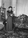 Mrs. Ford White in the "second day" dress from Mrs. Jay Gould's trousseau, which she modeled at the 20th Century Club tea. She is standing in a living room next to a sofa. She is holding and looking at a box in her hands. Published in Fort Worth Star-Telegram, morning edition, April 13, 1945.