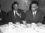 They Like It. Walter A. Richards, Columbus, Georgia, President of National Peanut Council, left, and John Burroughs, San Antonio, Texas, Vice President are shown at board's luncheon as they attacked with gusto the menu which was plentifully supplied with varied forms of the one-time lowly goober. Richards enjoys a cracker with peanut butter spread while Burroughs eats with relish a tossed salad with peanut oil dressing. Published Fort Worth Star-Telegram Morning Edition April 16, 1945.