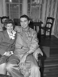 Back From Philippines. News of his buddy who is held by the Japanese as a POW was brought to Fort Worth by Sgt. Odell C. Paul shown with his wife while visiting Mrs. A.J. Bray of 4016 Calmont. Photograph of Sgt. Paul and Mrs. Paul sitting on a sofa. She is on the left in the photograph wearing a dress with a corsage. Sgt. Paul is dressed in his military uniform. Published Fort Worth Star-Telegram Morning Edition April 17, 1945.