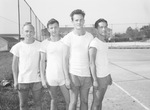 Texas Christian University tennis team which meets Southern Methodist University (SMU) on the campus courts. Left to right, Raymond Robbins, Vernon Mayfield, Bill Robinson and Richard Chu. All four tennis players are standing outside on the tennis court by the fence, wearing shorts and a T-shirt. Published in Fort Wort Star-Telegram, evening edition, April 21, 1945.