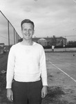 Texas Christian University tennis team. Doctor Fred West, coach. Doctor Fred West is standing outside on the Tennis court wearing a sweater shirt and pants. Published in Fort Worth Star-Telegram, evening edition, April 21, 1945.