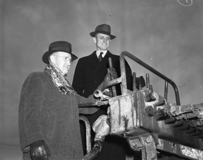 The Tarrant County Road Committee is examining the problems of road maintenance and suggesting ways to reduce the cost. Left to right are Luther Perry and Harrell C. Ashburn. They are looking over a disabled grader being repaired at the Precinct 1 garage. Mr. Perry, of Arlington, Texas, is wearing a hat, coat, scarf, and gloves. Mr. Ashburn of Fort Worth, Texas is dressed in a hat, suit, and a coat.