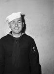Burton B. Paddock, mailman third class of the U. S. Navy. Paddock is shown standing in front of an empty wall wearing a naval uniform and smiling widely. He is in Fort Worth, Texas visiting his wife and their three children, Bill, Mary and Claudia. Paddock is a grandson of Captain B. B. Paddock, former mayor of the city. Paddock made the highest grade ever given on a general classifications naval test in San Diego. He was placed as section leader with the fleet records division of the naval post office in San Francisco. Published in the Fort Worth Star-Telegram morning edition, April 22, 1945.