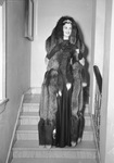 Helen Whiting Bertrand. She wears a long dress with long hand gloves and a tiara on her head. She also wears a long fur and walks down the stairs.