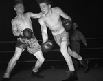 The Golden Gloves, an annual competition for amateur boxers, is kicking off their 1940 season in Fort Worth, Texas. Two men are shown in the ring with a referee in the background. The boxer on the right is ducking out of the way while the man on right is preparing to throw a right hook.
