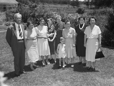 Sagamore Hill Garden Club is to have a flower show June 21 at Meadowbrook Country Club, and this group is in charge of arrangements. Left to right, they are W. T. Hightower, Mrs. S. D. Higgason, Mrs. O. W. Boggs, president of the club; Mrs. A. C. Cooke, Mrs. G. L. Wilkinson, Mrs. G. M. Slagle, Mrs. C. E. Dimock, Mrs. H. C. Austin and Ronald Boggs (child standing in front of Mrs. Wilkinson and Mrs. Slagle). This picture was taken when the group met at the home of Mrs. Higgason. They are standing outside. Mr. Hightower is wearing a suit with the jacket unbuttoned and a necktie. Mrs. Higgason is wearing a dress with a square neckline and that is belted at the waist. Mrs. Boggs is wearing a solid colored dress with buttons down the bodice and she is holding a flower. Mrs. Cooke is wearing a dress with buttons down the bodice and lace detailing lining the collar and sleeves. Mrs. Wilkinson is wearing a floral print dress, pearl necklace and eyeglasses. Mrs. Slagle is wearing a floral print blouse tucked into a skirt. Mrs. Dimock is wearing a dark colored dress and a long necklace that comes halfway down the bodice. Mrs. Austin is wearing a v-neckline blouse tucked into a skirt, and eyeglasses. She is holding a dark colored handbag in her left hand. Ronald is wearing striped overalls.