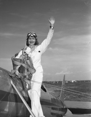 Ingalls, Laura (Miss); Air pilots; Fighter pilots; Hollywood Aces Air Show; Air shows; Airplanes; Coveralls; Goggles; Scarves; Municipal Airport