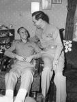 Staff Sergeant Thomas P. Whitaker (left) and his brother, Lieutenant John Whitaker (right). Sergeant Whitaker is sitting in a chair while his brother, Lieutenant Whitaker is beside him, sitting on the arm of a chair. Both men are smiling widely at each other in their military uniform. The chairs they are sitting on are patterned. Behind them is a shelves with various animal dolls, a wall with a few framed pictures and a window curtain. This is the first time the brother have seen each other in three years. Both have been wounded in battle.