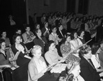 Inter-Faith Chorus group singing. A large group of women singing as part of a choir. The group is rehearsing for a performance at Will Rogers Memorial Auditorium.