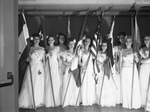 Texas Pan-American Relations Day. Flag bearing group, left to right, Polly Terrill, Bettye June Thompson, Bonnie Osburn, Hattie Stanley, Ann Barham, Doris McGoldrick, Marylou Miller, Dorothy Nuss, Betty Jean Schumuck and Jane Barham. A group of women standing while holding flags at the Rogers Memorial Auditorium.