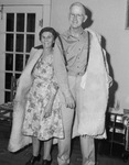 Mr. and Mrs. R. C. Parker are modeling the overcoat sent home by their son, Sergeant R. C. Parker Junior. Sergeant Parker is serving in an engineer unit of the 90th Division of the 3rd Army. He purchased the coat in Paris, France and wore it during the winter months of the French, Belgium, and German campaigns. Mrs. Parker has her right arm in the coat while Mr. Parker has his left. Mrs. Parker is wearing a floral dress. Mr. Parker is dressed in button-up shirt, trousers, and suspenders.
