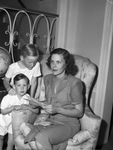 Mrs. John Randolph (Randy) Thompson and two sons, Randy Thompson, Junior and Tim Thompson. A letter from their father rivets the attention of John, Jr., who stands behind his brother, Tim, as Mrs. Thompson reads them a message which brought cheer to another Fort Worth woman, Mrs. J. B. Laski, in the form of news that her grandson had been rescued at sea. Mrs. Thompson is sitting in an arm chair surrounded by her two children.