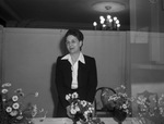 Business and Professional Women's Club Flower Show. Miss Mary Findley and entry. Miss Findley was sweepstakes winner of the Business and Professional Women's Garden Club Spring flower show in the Worth Hotel. Mrs. Findley is standing behind a table with three flower arrangements.
