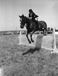 Diamond L. Ranch Horse Show. Susana Philips riding "Buck Dean," owned by Mrs. H. H. Philips, San Antonio, Texas. Miss Philips is shown riding a horse while it jumps over a fence.