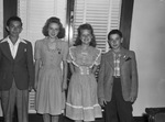 Clipping: "1945 Junior High Citizenship Award Winners Announced. Winners of the 1945 citizenship awards, given by the three Fort Worth chapters of the Daughters of the American Revolution to two outstanding students of each of the city's junior high schools, were announced Wednesday. The presentations are made each spring by the organization at programs in the schools. This year's winners, their schools and the DAR chapter making the awards are: Jeanette Cole and Jimmy Bass, Rosemont; Arlene Lisman and Garnett Ryon, Ernest Parker; Marilyn Brachman and John Halter, McLean; Elmo Reeves and Georgia Mae Cloud, Handley; Dan Wall and Myrtle Mayner, Diamond Hill; Wanda Wilks, Lena Pope Home; J. W. Renfro and Pat Lucas, P. P. Elder, and Dick McKess and Ruth Butts, Meadowbrook, all Mary Isham Keith Chapter. James Fritts and Maxine Buchanan, Amon Carter Riverside, and Berney Williams and Ann Tidball, W. C. Stripling, Fort Worth Chapter. Diane Sweatman and Harry Rosenstein, E. M. Daggett, and Beverly Sone and Ronald Nelson, William James, Six Flags Chapter. The Mary Isham Keith Chapter also presented awards to a representative of the Fort Worth Boys Club, C. W. Bynum, and the winner in an essay contest on 'Americanism,' Kenneth Mathis, of William James Junior High School." Published Star-Telegram Eve. May 23, 1945. Four of the D.A.R. award winners are left to right: Elmo Reeves, and Georgia Mae Cloud, from Handley, Texas; Wanda Wilks and Jimmy Bass. Elmo is wearing a sport coat, a light-colored collared shirt, and houndstooth trousers. Georgia Mae is wearing a dress with a ruffled collar and skirt pockets, and silk or nylon stockings. Wanda is wearing a striped short-sleeved dress with the skirt gathered at the waist and eyelet-trimmed ruffles on the empire bodice and eyelet around the skirt Jimmy is dressed in a plaid dress shirt, a houndstooth sport coat and dark suit pants. The children are in front of a Venetian blind-covered set of windows.