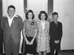 Clipping: "1945 Junior High Citizenship Award Winners Announced. Winners of the 1945 citizenship awards, given by the three Fort Worth chapters of the Daughters of the American Revolution to two outstanding students of each of the city's junior high schools, were announced Wednesday. The presentations are made each spring by the organization at programs in the schools. This year's winners, their schools and the DAR chapter making the awards are: Jeanette Cole and Jimmy Bass, Rosemont; Arlene Lisman and Garnett Ryon, Ernest Parker; Marilyn Brachman and John Halter, McLean; Elmo Reeves and Georgia Mae Cloud, Handley; Dan Wall and Myrtle Mayner, Diamond Hill; Wanda Wilks, Lena Pope Home; J. W. Renfro and Pat Lucas, P. P. Elder, and Dick McKess and Ruth Butts, Meadowbrook, all Mary Isham Keith Chapter. James Fritts and Maxine Buchanan, Amon Carter Riverside, and Berney Williams and Ann Tidball, W. C. Stripling, Fort Worth Chapter. Diane Sweatman and Harry Rosenstein, E. M. Daggett, and Beverly Sone and Ronald Nelson, William James, Six Flags Chapter. The Mary Isham Keith Chapter also presented awards to a representative of the Fort Worth Boys Club, C. W. Bynum, and the winner in an essay contest on 'Americanism,' Kenneth Mathis, of William James Junior High School." Published Star-Telegram Morn. May 23, 1945. Four of the D.A.R. award winners are (left to right): Dick McKee, Ruth Butts, Myrtle Mayner and Kenneth Mathis. Dick is wearing a dress shirt, sport coat, and dark suit pants. Ruth is dressed in a fitted two-piece dress with a checkered blouse and a dark skirt with checkered trim and a cloth corsage near her shoulder. She is wearing a ring and a flower in her hair. Myrtle is wearing a plaid coat over a checkered jumper with a with lace-trimmed blouse and a heart-shaped locket. Kenneth is dressed in a dark double breasted suit with a striped dress shirt and a dark tie.