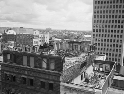 Workmen began razing the 50-year-old Wheat Building on Eighth and Main Streets to make way for a modern two-story building. The elevator house atop the building can be seen partially wrecked while stones on the north wall of the top floor already have been removed. Several other buildings can be seen in the background.