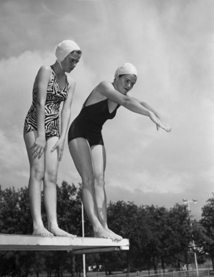 Swimming pools; Diving boards; Bathing suits; Fort Worth Recreation Department; Sylvania Park; Sylvania Park Pool; Darby, Rosemary; Dillard Nancy
