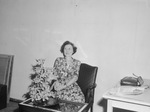 Mrs. Philip R. Walker, sweepstakes winner of the Spade and Trowel Garden Club spring flower show held Monday, with her blue ribbon winner of day lilies in a flat copper container. The container is placed on at table next to the chair in which Mrs. Walker is seen to be seated in. Mrs. Walker is seen to be wearing a floral printed dress and eyeglasses. Published in Fort Worth Star-Telegram, morning edition, May 15, 1945.