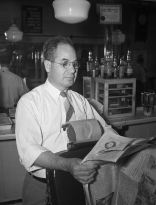 Nick Petta, Italian-born citizen of Fort Worth, Texas, reading the headlines in the Star-Telegram announcing that Italy has entered World War II. Petta has been away from Italy for more than 40 years. He is standing behind a chair, wearing a collared, button-down shirt, trousers, a striped necktie and eyeglasses.