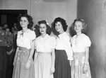 Clipping: "Awards Go to Six Students. The outstanding students of J. P. Elder Junior High School, elected by the faculty and student body, were presented awards in a recent program in the school auditorium. Judge Atwood McDonald presented the American Legion Award to Latryl Latyon, 2215 Columbus, and Brown Tomme Jr., 2508 Honeysuckle. The Danforth Foundation Award was won by Helen Duffey, 1201 Glenwick Dr., and Benedict Nieswiadomy, 2304 Clinton. The J. P. Elder Merit Awards winners were Martha Reid, 1511 Denver, and Harry Byars, 1509 Grand. Mrs. Blanc D. Doyle, student council sponsor, presented the certificates. All awards were based upon scholarship, honor, leadership and service. Doris Coonrod, student body president, presided over the program and the principal, R. Gl. Wilkerson, introduced the speakers." Published Star-Telegram Eve. May 16, 1945. The winners left to right are: Latryl Layton, Helen Duffey, Martha Reid, There is an unidentified woman standing between Helen and Martha. Latryl received the American Legion Award and is wearing a light blouse trimmed with eyelet at the neck and short puff sleeves and threaded with ribbon, striped skirt gathered at the waist, a bracelet and ring and a booster pin on her blouse, and ribbons in her hair. Helen received the Danforth Foundation Award and is is wearing a light pleated trimmed blouse with ruffles and puff sleeves, tucked into a light colored A-line skirt, and has eyeglasses and bows in her hair. Martha won the J. P. Elder Merit Awardand is dressed in a light embroidered blouse gathered at the neck and short sleeves by ribbons, and a floral skirt. The boys who won the three awards are standing in the background. The unidentified woman is wearing a light long-sleeved blouse with ruffles and a dark A-line skirt. She has on earrings.