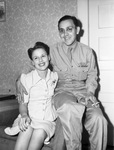 Corporal Eugene M. Gore is having a happy reunion with his wife at the home of his mother, Mrs. Vera Gore, after spending three-and-a-half months in a German prisoner of war camp. Corporal Gore was a Star-Telegram carrier salesman and a graduate of Arlington Heights High School. He was formerly a mail order clerk at Montgomery Ward's. He is sitting on the edge of a chair with an arm around his wife. He is dressed in his military uniform and is holding a cigarette. Mrs. Gore is seated, wearing a button-up blouse, skirt, and a brooch.