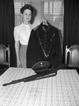 Mrs. Pearl Voorhees holding a Nazi storm trooper uniform that was sent to her by her son, Sergeant Samuel Smith. She is standing in front of a table that has a decorative print on it. On the table is a rifle and a hat. Mrs. Voorhees is wearing a dress with lace details and glasses.