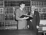 Library Beginning. Homa S. Hill (left), library chairman, and George W. Steere, attorney, who Thursday was appointed by Commissioners Court as librarian of the new county law library housed on the courthouse's third floor, look through one of more than 2,000 volumes that forms the nucleus of the library, which will be opened to the public as soon as necessary remodeling is finished. . Both men are shown standing in front of shelved law books. Hill is holding a book open and both are looking at it. Both are dressed in suits. Published Fort Worth Star-Telegram Morning Edition May 18, 1945.