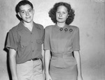 Clipping: "Two Graduates Will Get Medals. Faith Hill, 2814 Purington, and John Martin, 709 Haynes, spring graduates of William James Junior High School, will be awarded American Legion citizenship medals in a program in the school auditorium at 12:40 p.m. Friday. The awards will be presented by Drew Clifton, post commander of the Bothwell Kane Post No. 21. The student body of the school elected the winners on a basis of scholarship, honor, leadership and service." Published Star-Telegram Morn. May 20, 1945. John is wearing a dark button-up shirt with cuffed sleeves and light khaki-looking trousers, held up with a belt. Faith is wearing a two piece tress with a peplum-style fitted top that crosses over at the top and fastens with three large buttons and at the waist band with two small hook-and-eye fasteners. The slim skirt is a simple A-line.