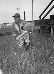 Lieutenant Bill La France, is the ace pitcher of the Fort Worth Army Air Field. He will likely start in the upcoming match-up against the Eagle Mountain Marines. The military teams are set to square off Wednesday in a double header. Lieutenant France is shown kneeling in a field near the bleachers. He is dressed in a baseball uniform.