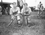 Centerfielder Doc O'Neill, left, and second baseman Jackie Sullivan of the Worth Clothiers are discussing batting strategies. If the Clothiers beat the Fliers, they with sew up the first half of the championship. O'Neil and Sullivan are kneeling in the grass, holding their bats and wearing baseball uniforms. The field and their teammates are in the background.