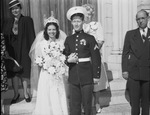 Corporal and Mrs. Robert J. Gallagher married at St. Patrick's Catholic Church, will live in Fort Worth while he is stationed at Eagle Mountain Marine Air Base. She is the former Miss Clara Mercurio, daughter of Mr. and Mrs. John C. Mercurio of Detroit, Michigan. They appear standing to each other outside the church; Mrs. Gallagher appears to be wearing her bride dress,a big bouquet of flowers, and a tiara. Cpl. Gallagher is wearing his Air force uniform