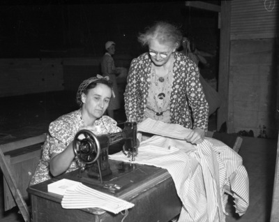 The first of the mattress making projects being sponsored by the Tarrant County Home Demonstration Club Council at Azle, Texas. Mrs. Minnie Prater, seated at the sewing machine, assisted by Mrs. Lee Moran, standing, right, is sewing the first ticking for a mattress. Mrs. Prater is wearing a floral print dress. Mrs. Moran is wearing a dress, floral print blazer, a necklace and eyeglasses. They are both members of the Azle Home Demonstration Club. Application to make mattresses for themselves can be made by any farm family having an annual income of less than $400. West Texas cotton for filler and ticking is furnished by the Government. The only cost to the applicants is 35 cents for thread and needles.
