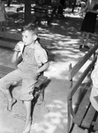 Grapevine, Texas, school children visiting Forest Park in Fort Worth, Texas. Jerry Plumlee is sitting on a bench and eating a snow cone. He is barefoot, wearing a collared shirt and striped overalls.