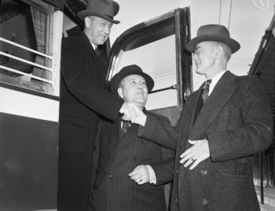 Members of the Tarrant County Road Committee went on a two-hundred mile tour of sections of the county's road system. They are studying ways to reduce road and bridge costs in the county. Arlington, Texas Mayor W. F. Altman, is greeting the committee members as they descended from a chartered bus. Left to right are Marvin Nichols, John Luttrell, and Mayor Altman. Mr. Nichols, committee chair, is wearing a hat, suit, and coat. Mr. Luttrell is dressed in a hat and a double breasted pinstripe suit. Mayor Altman is wearing a hat, suit, and a tweed coat.