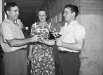Mr. Tompkins is wearing a short-sleeve collared shirt and trousers. Mrs. Howard is dressed in a fitted floral blouse with a square bodice and matching skirt, carrying a patent leather purse under her arm. Mr. Stacy is wearing a button-up shirt with cuffed sleeves and trousers and a wrist watch band. He is holding a bunch of artificial flower poppies. They are standing in a covered breezeway of a large building (looks like an agricultural building at the Will Rogers Coliseum) Clipping: "AT KICK-OFF SALE--John M. Tompkins, left, gave $25 for the poppy being presented him by J. M. Stacy, discharged AAF veteran, who was auctioneer at a Kick-off sale Friday for the Saturday poppy sale being sponsored by the Auxiliary to the Liberator Village Post of American Legion, Mrs. E. T. Howard, center, who supervised the sale, is auxiliary president. (Staff Photo.)" Published Star-Telegram Morn. May 26, 1945.