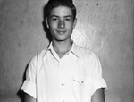 Clipping: "2 Meadowbrook Pupils Honored. Two graduates of Meadowbrook Junior High School who have been awarded American Legion citizenship awards are Marylen Bauer, daughter of Mr. and Mrs. Ml J. Bauer, 608 Chicago, and Bob Gidley, son of Mrs. Edith Gidley, 1841 Provine. Representatives of the Bothwell Kane Post presented the medals Friday at a program in the school auditorium. Lt. R. K. Clifton made the address and Nat M. Kilson, post adjutant, made the awards." Published Star-Telegram Eve. Jun 1, 1945. Bob is standing against the Star-Telegram photo wall wearing a white button-up short-sleeved shirt with cuffed sleeves.