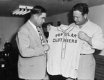 The Popular Clothiers' amateur baseball team is transitioning into new ownership. Inspecting the uniform and discussing the new Panther City League team are Smokey Joe Smith (left) and Harrold Webb. Smith is a pitcher and player-manager of the team. He is dressed in a hat and a suit. Mr. Webb previously played with Convair, but the owner will join the Popular Clothiers' nine. He is wearing a button-up shirt with cuffed sleeves.