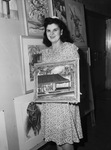 Mrs. Marie Welch Fuertsch is an art instructor for the Recreation Department. Some of her students' works are on display during the Art Show at Will Rogers Memorial Coliseum. The art show is part of the Spring Festival celebration. Mrs. Fuertsch is shown displaying one of her student's paintings. The oil depicts a flower shop with a striped awning extending over the sidewalk. Mrs. Fuertsch is wearing a floral dress and a bow in her hair.
