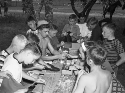 Leather craft class at the Young Men's Christian Association's (YMCA) Camp Holland near Weatherford, Texas. A group of children are gathered around an outdoor table, making different crafts. One boy, at left, is working on a shoe.