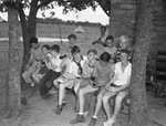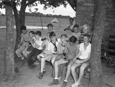 Camp Holland, the Young Men's Christian Association (YMCA) summer camp, attendees included, left to right, (on bench) Billy Brown, Paxton Moore, Bobby Robertson, Gordon Boswell Junior, Richard McGuire, V. L. Chase Junior, Buster Bryant and Raymond Walker. On the back row, left to right, are A. S. Tinsley, Bill Leavy, Pat Edwards, and John Phillips. The bench is between two trees and a third tree is slightly in front. Most of the boys are drinking soda pop. They are all wearing a combination of either t-shirts or collared shirts, and trousers or short pants. Several cases of soda bottles are leaning against a brick building in the background at the far right.