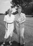 Women's golf tournament left to right, Mrs. George Thompson Junior and Mrs. Kellogg Boynton. They were the only sisters to qualify for the championship flight in the City Women's Golf Tournament. They are standing in the fairway with a golf club in their hands. Mrs. Thompson is wearing a light-colored button-up dress and is holding her hat. Mrs. Boynton is wearing checkered button-up dress and a golf glove on her left hand.