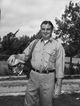 Lieutenant (Junior Grade) Bill Ratliff is a Landing Ship, Tank (LST) navigator in the United States Navy. During the Normandy invasion he landed troops on Omaha Beach. He is observing D-Day by playing a restful game of golf. Lieutenant Ratliff is carrying his golf bag on his shoulder. He is dressed in a button-up shirt with cuffed sleeves and trousers.