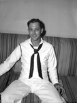 Sailor Frank Ligon Junior is a crew member on the USS Sangamon. He is on leave in Fort Worth, Texas, while his ship is being repaired in Norfolk, Virginia. The Sangamon was severely damaged when a Japanese plane struck the ship. Thirty-five of the 900 man crew were lost in the attack. Mr. Ligon was on the catwalk when the bomb exploded and pierced the flight deck. He and the other crew members fought fires on the ship for several hours while sailing back to the United States. Ligon, who enlisted in the Navy in May of 1944, is on Survivor's Leave before returning to duty. He is sitting on a couch, dressed in his military uniform.