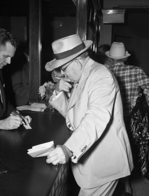 Checking in and relaxing at the Baker Hotel in Mineral Wells, Texas, were the vanguard of the Texas Press Association (TPA) convention, opening for its 61st annual three-day session. Shown here is Sam P. Harben of Richardson, Texas, secretary of the TPA for 33 years, as he checked in at the front desk. He is wearing a hat, suit and eyeglasses.